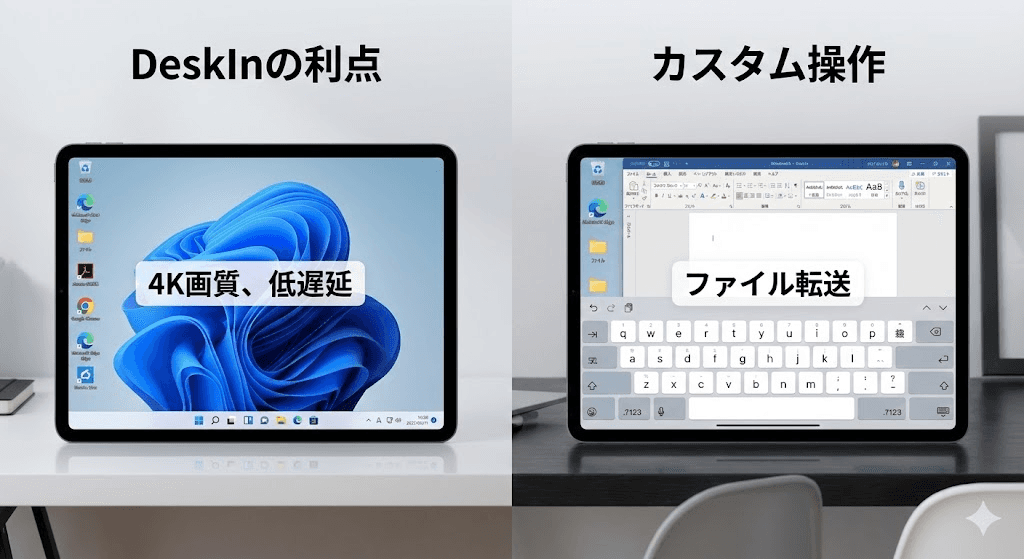 他のツールがWindows PC間でしか動作しなかったり、iPadOSをサポートしていなかったりするのに対し、DeskInは両方の世界をシームレスにつなぎ、余分な設定なしでiPadから直接Windowsデスクトップを操作できます。