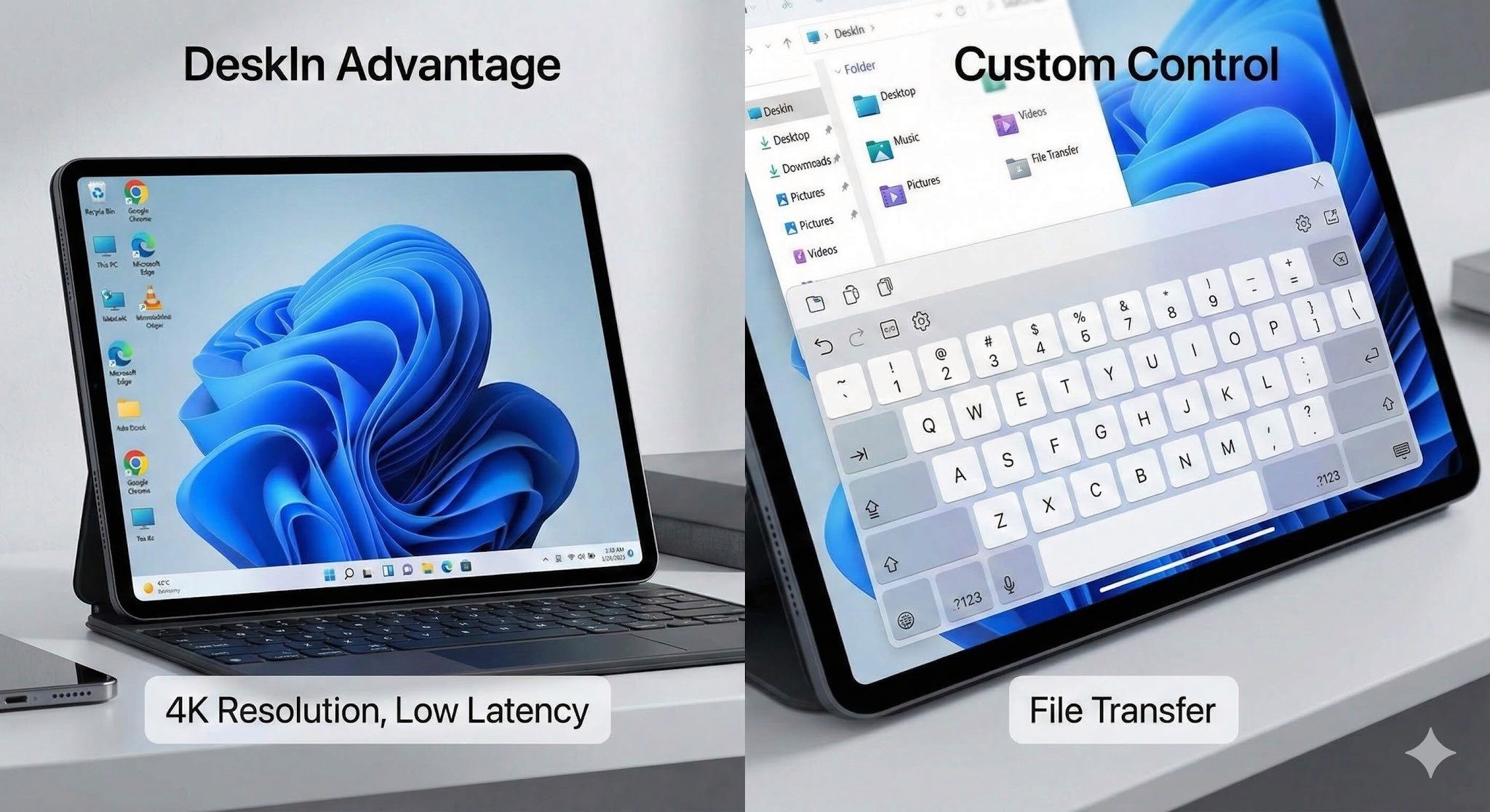 DeskIn 支援無線連接,具備跨平台相容性與 4K 高畫質傳輸能力,特別適合需要遠端控制和檔案傳輸的遠距協作場景。